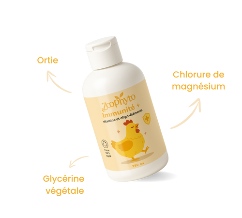 Macération d'ortie, glycérine végétale, chlorure de magnésium, propylène glycol (1,5%). Constituants analytiques : Protéine brute : <0 % ; Fibres brutes : <0 % ; Matières grasses brutes : 5,42 % ; Cendres brutes : 0,55 % ; Sodium : 0 % ; Lysine : 0 % ; Méthionine : 0%.